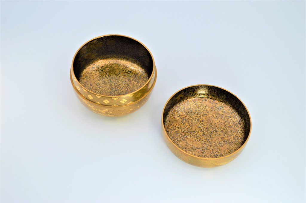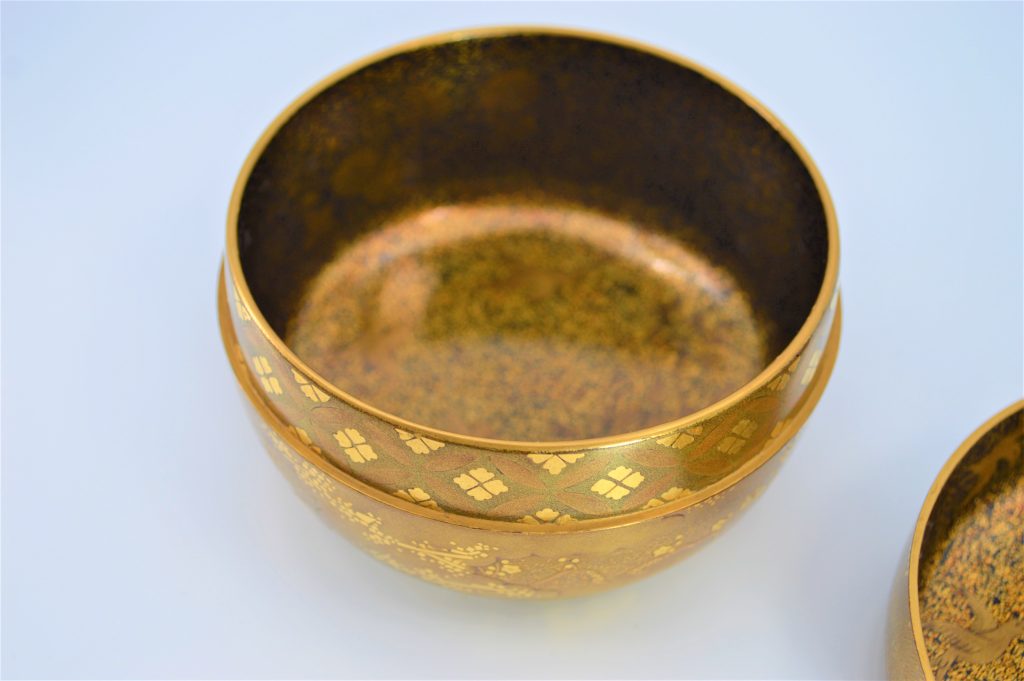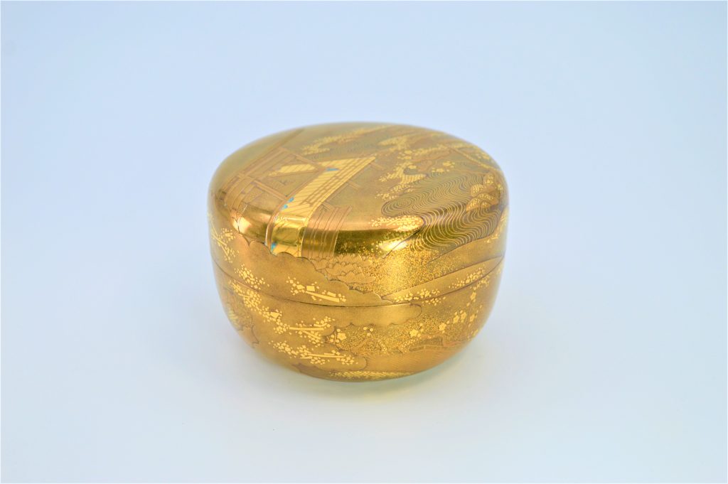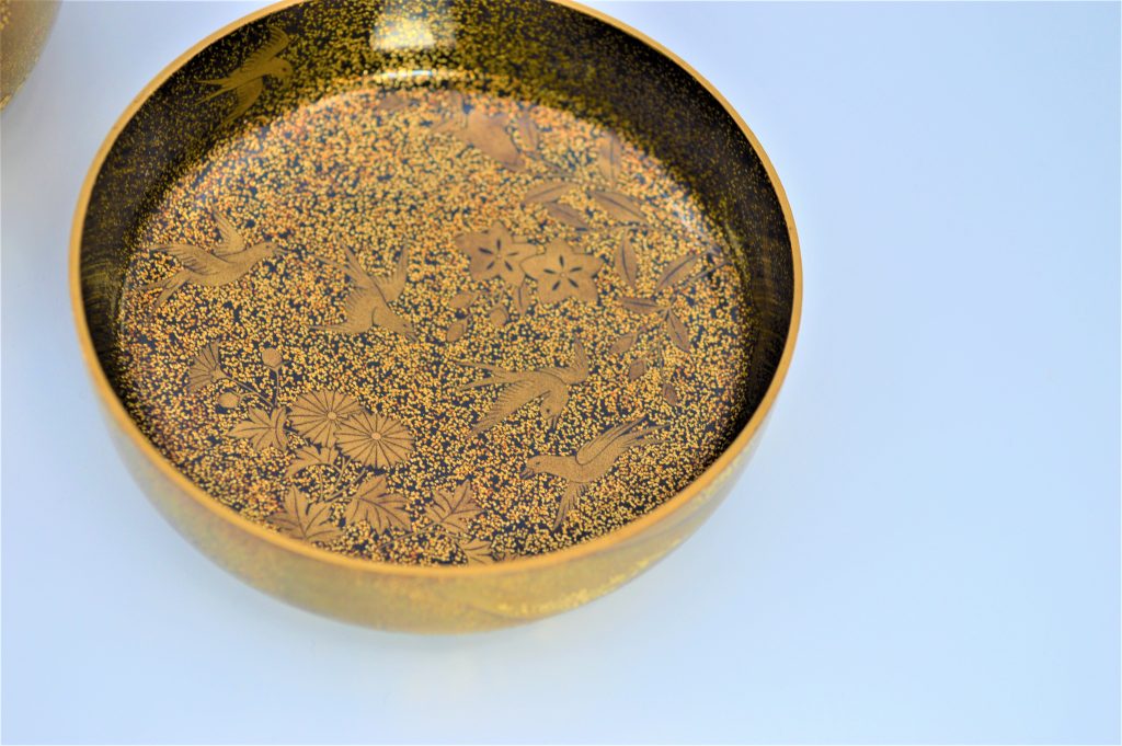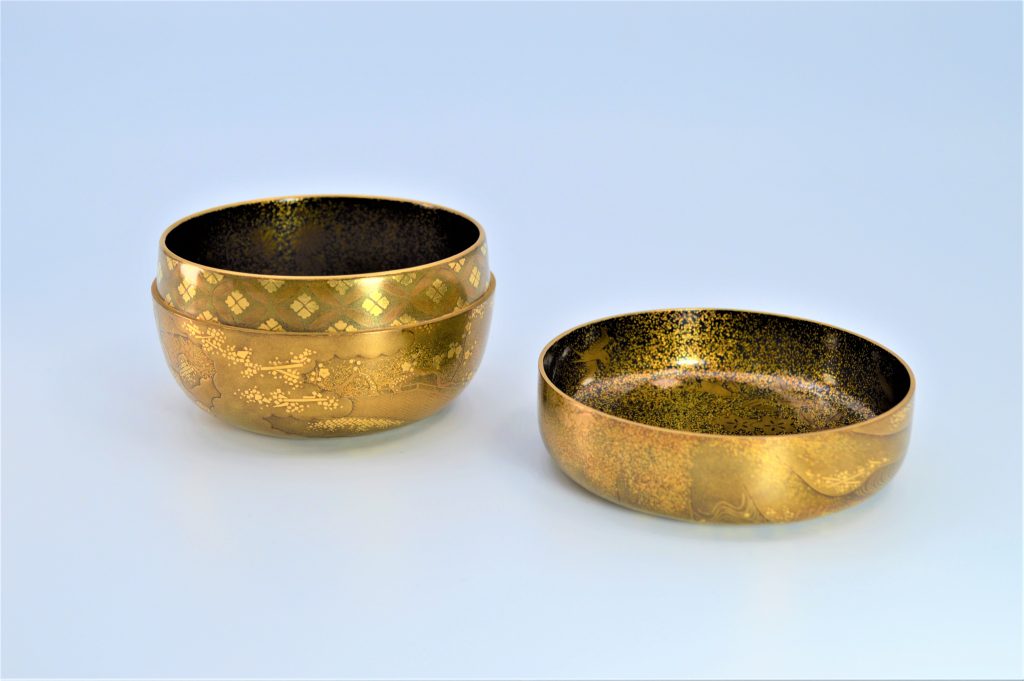 「初音(はつね)」は『源氏物語』「初音」の巻の情景を意匠化した図柄で、「初音」はまた「初子(はつね)」に通じ、婚礼の調度の意匠としても好まれた。